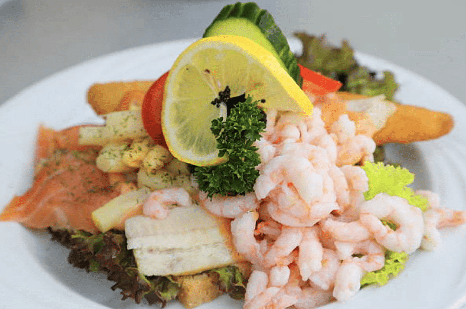 Dampet fisk, stegt fisk, røget laks, rejer, asparges, salat, rød dressing serveres på brød